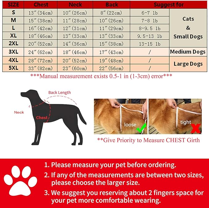 DOG WINTER COAT — METAL ZIPPER or PLASTIC ZIPPER, random to ship. This pet coat is suitable for Cat & Small Dog(S-2XL), Medium Dog (3XL), Large Dog(4XL-5XL)! Please refer to the size chart (Picture 2), choose a right size for your pet. If any of the measurements are between two sizes, please choose the larger size. We suggest you reserving about 2 fingers space for your pet more comfortable wearing.