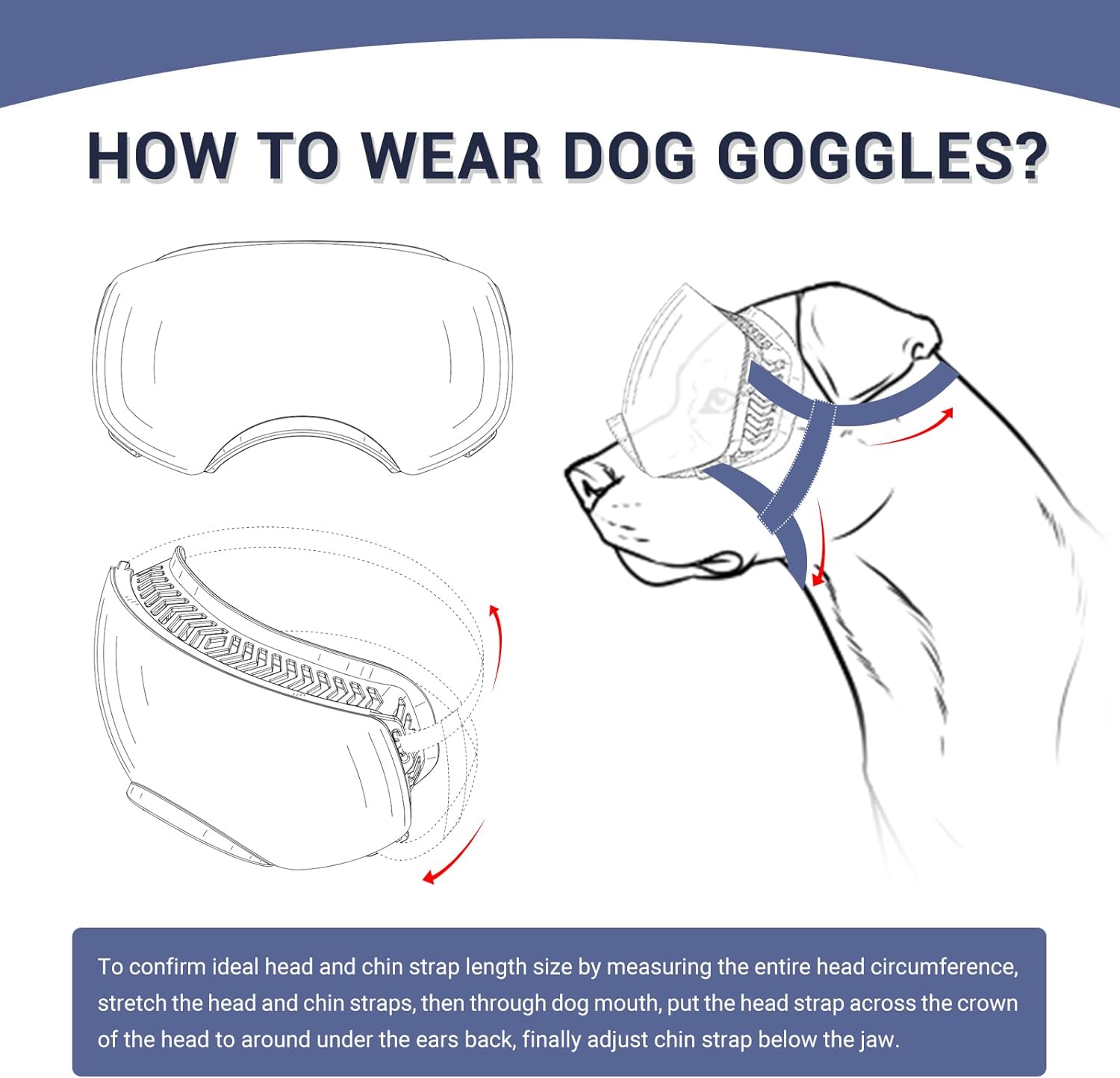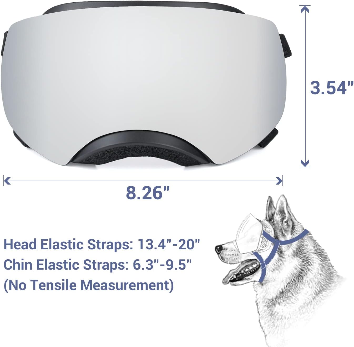 Frame Perimeter: 8.26″, Height: 3.54″. Head Elastic Straps: 13.4″-20″; Chin Elastic Straps: 6.3″-9.5″. (No Tensile Measurement) The middle of the glasses can be bend adjusted to fit head and avoid glasses slipping off and hurting dog eyes.