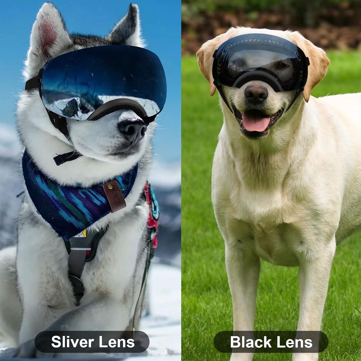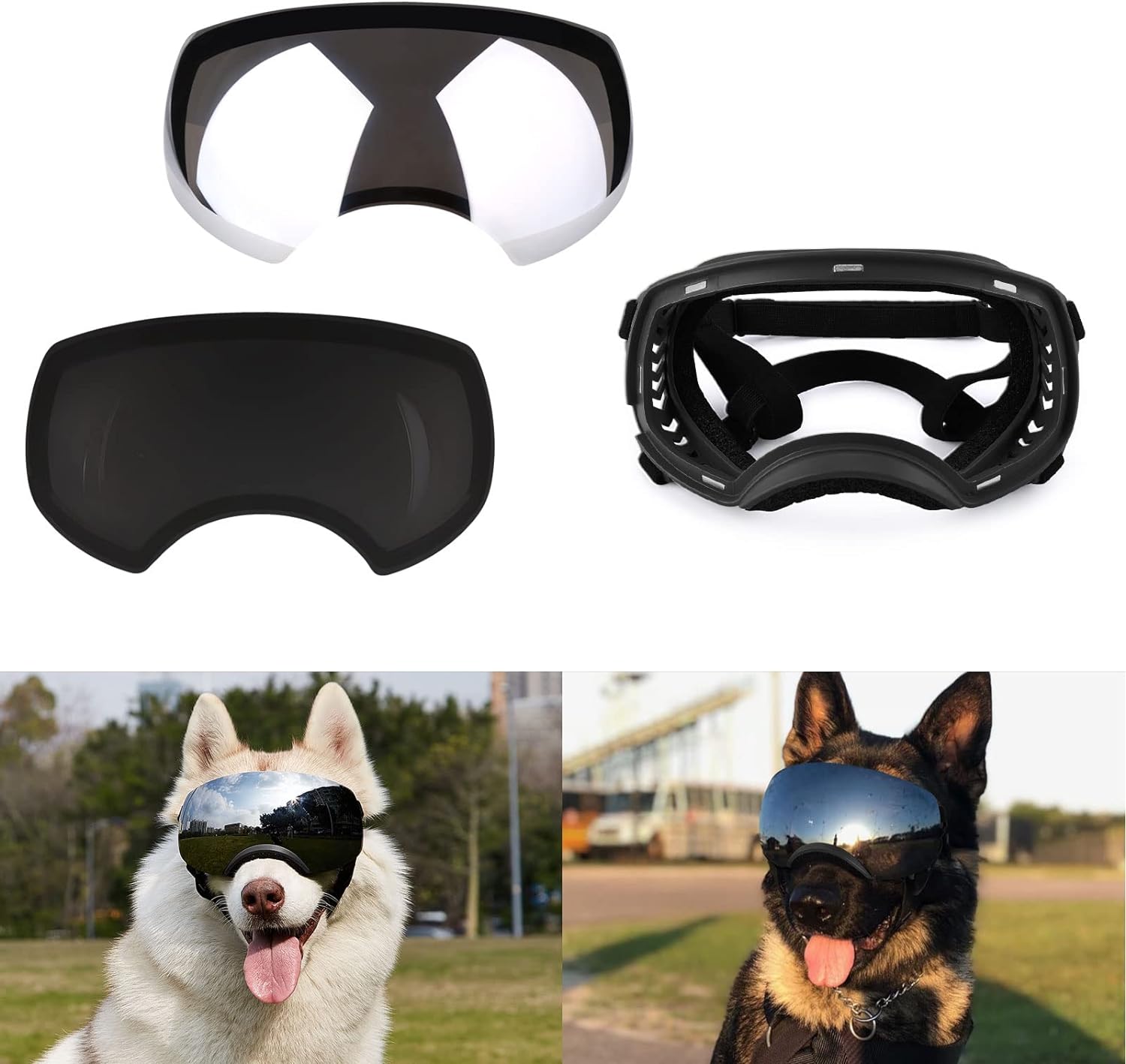 PROTECT YOUR DOG?S EYES: These dog goggles are way suitable for medium to large sized dogs, such as Alaskan Malamutes, Samoyeds, Labradors, Border Collies and other similarly-sized breeds. The lenses can protect the dog?s eyes from UV400. Besides, it can well prevent wind, snow, debris, dust, sharp objects or sand particles from harming the dog?s eyes.