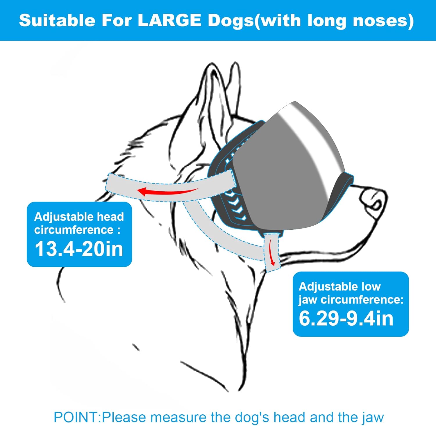 DIMENSIONS: The head curve is 6.3 inches long and the lower curve is 4.3 inches long. The head strap can be adjusted from 13.4 inches to 20 inches. The adjustable range of the chin strap is from 6.29 inches to 9.4 inches (without stretching). Please measure your dog?s head circumstance, chin size and curve length of nose before placing an order.